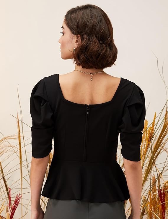 Women’s Solid Crepe Square Neck Puff Sleeve Regular Fit Peplum Knit Top